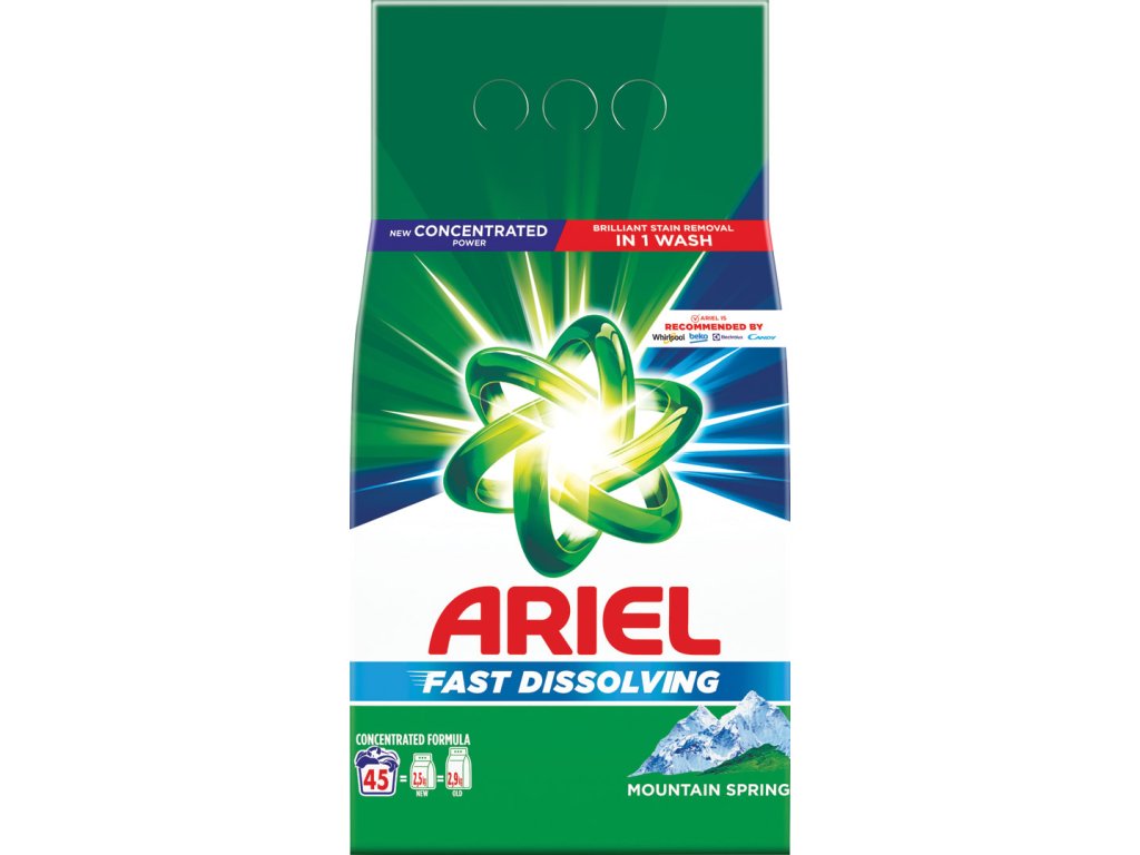 Prací prášok Ariel s koncentrovaným zložením poskytuje koncentrovanejšiu silu a operie viac bielizne na jeden gram prostriedku. Zaisťuje vynikajúce odstraňovanie škvŕn už pri 1. praní. Vďaka jedinečnej technológii rýchlorozpúšťania sa pri kontakte s vodou rýchlo rozpustí, ihneď aktivuje a preniká hlboko do vlákien aj pri praní na nižších teplotách. Znížte teplotu prania na 30 °C a ušetrite až 60 % energie. (Spotreba energie práčkou pri prechode zo 60 °C na 30 °C, bežný cyklus). Programy na pranie pri nižších teplotách pomáhajú chrániť vašu bielizeň dlhšie ako programy na pranie pri vyšších teplotách. Zloženie s obsahom biologicky odbúrateľných zložiek (80 % všetkých organických zložiek je biologicky odbúrateľných). Navyše má prací prášok Ariel Mountain Spring úplne recyklovateľný kartónový obal vyrobený z papiera s 80 % podielom recyklovaného materiálu.