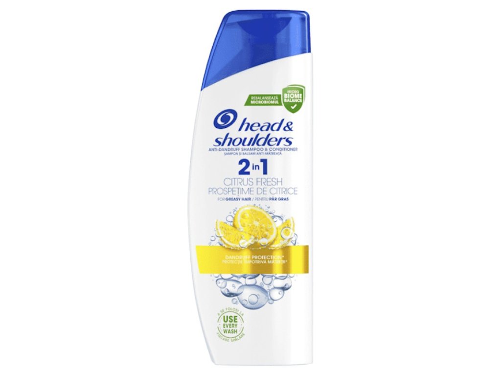 Šampón a kondicionér proti lupinám Citrus Fresh 2 v 1 poskytuje okamžité osvieženie, hĺbkovú hydratáciu a je ideálny na každodenné používanie, Až 100 % bez lupín (viditeľných lupín, pri pravidelnom používaní), Zloženie Microbiome Balance sa zameriava na hlavnú príčinu vzniku lupín, pomáha im predchádzať a upokojuje pokožku hlavy, Toto klinicky overené a dermatologicky testované zloženie má vyvážené pH s 0 % obsahom parabénov, fosfátov alebo parafínov, Ideálny šampón a kondicionér 2 v 1 pre mužov aj ženy s akýmkoľvek typom vlasov, Fľaša je vyrobená zo 40 % recyklovaného plastu (okrem vrchnáka, farbív a prísad) a je recyklovateľná (okrem vrchnáka a v závislosti od recyklačných zariaden