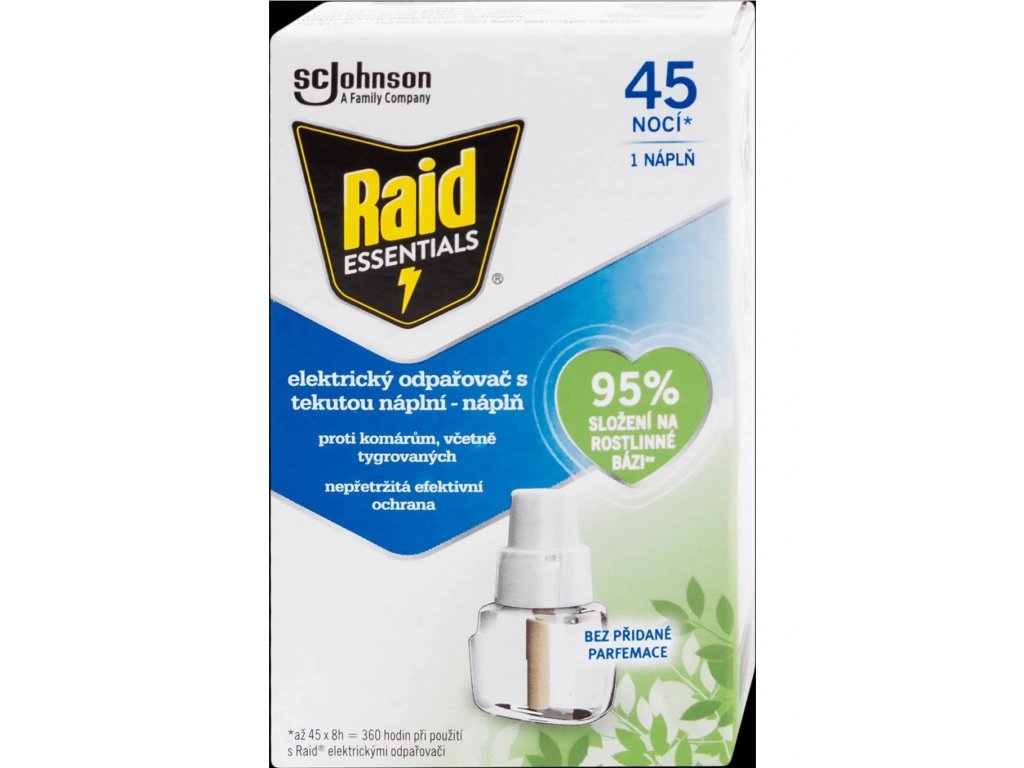 Tekutá náplň Raid Essentials je špeciálne určená do elektrického odparovača. Spoľahlivo ochráni pred komármi, odpudzuje aj komáre tigrované. Chráni počas až 45 nocí a z 95 % obsahuje zložky na rastlinnej báze. Účinná je aj pri mierne otvorených oknách a rozsvietených svetlách. Použitá môže byť aj v miestnosti s deťmi od 6 mesiacov. Tekutá náplň Raid Essentials v kombinácii s odparovačom zaručí ochranu pred obťažujúcimi komármi.